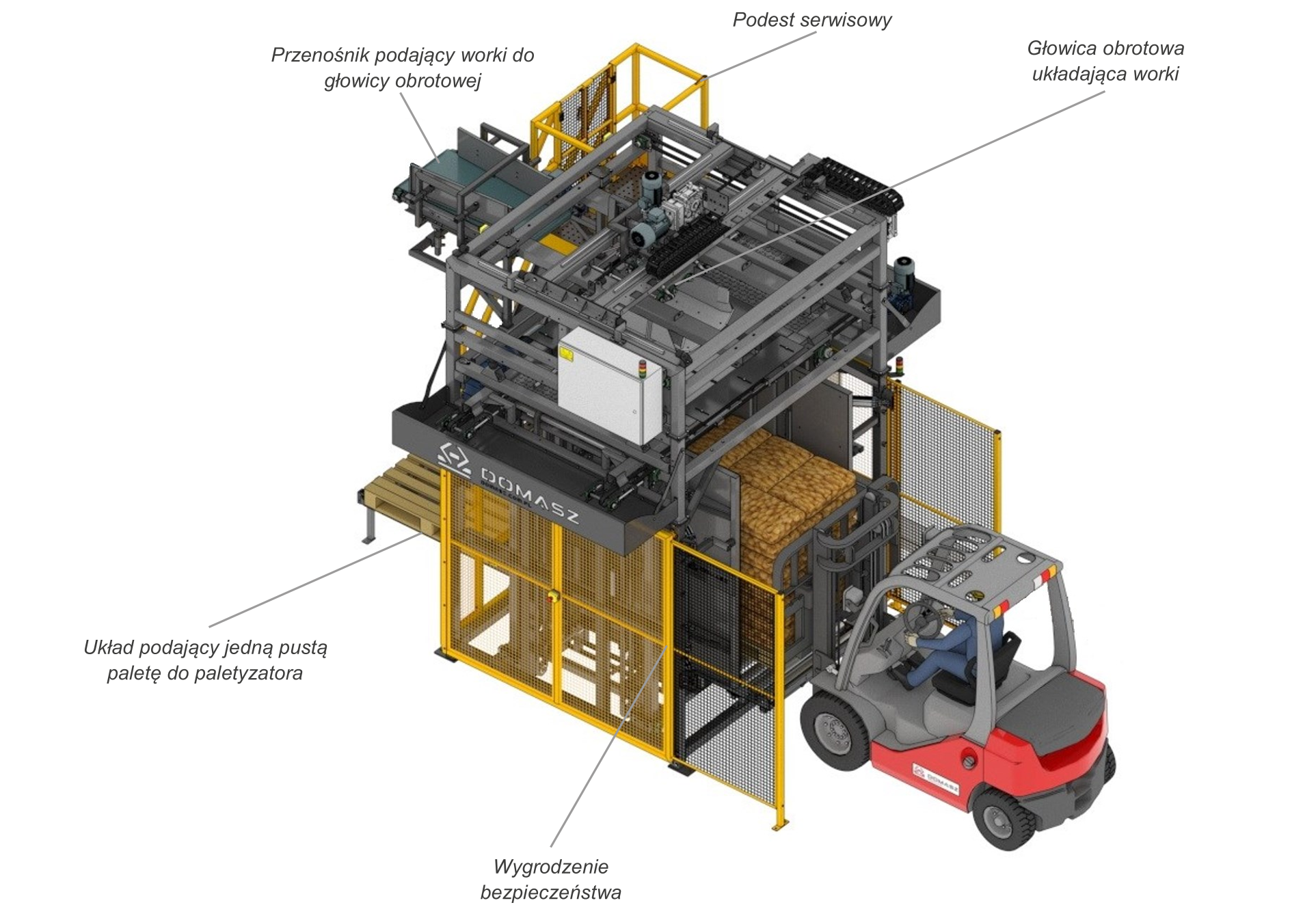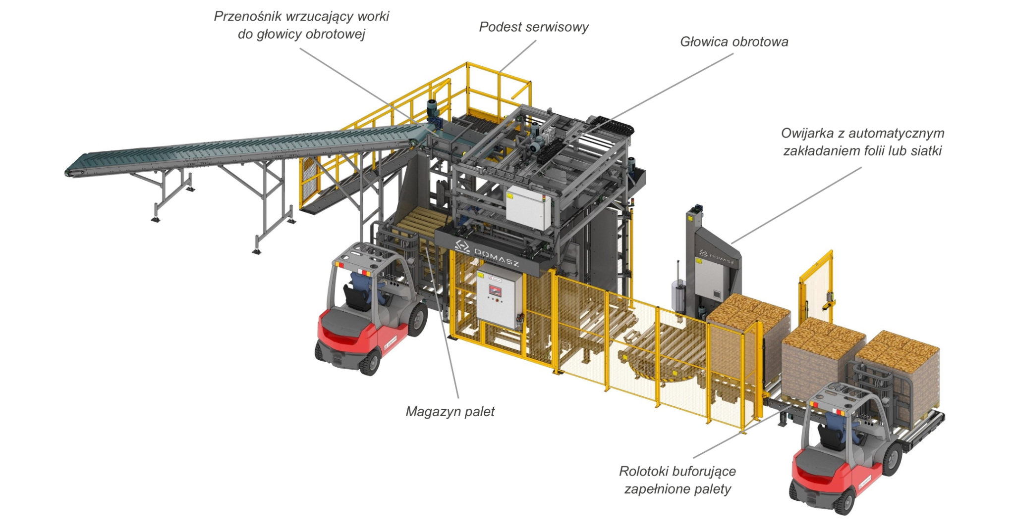 Modele PK-4, PK-6 oraz PK-8 są w pełni automatycznym systemem paletyzacji. Proces paletyzacji rozpoczyna się od podania pustej palety z magazynu palet do paletyzatora. Następnie paletyzator układa worki na palecie, a po zakończeniu układania paleta z towarem transportowana jest do owijarki. Owijarka pracuje w cyklu automatycznym rozpoczynając i kończąc owijanie bez udziału operatora. Po owinięciu palety siatką lub folią, paleta transportowana jest w miejsce buforowania, skąd może zostać pobrana przez operatora. Rozwiązanie w pełni automatyczne ogranicza ilość osób niezbędnych do przygotowania gotowych palet z produktem.